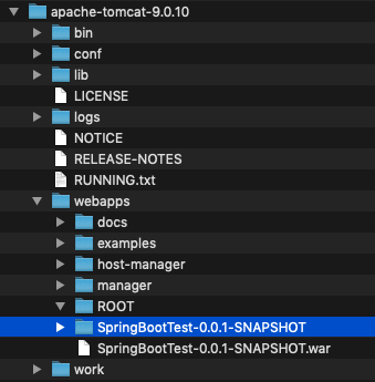 Tomcat 을 실행하면 war 파일을 Deploy 하여 폴더가 만들어지게 됩니다.