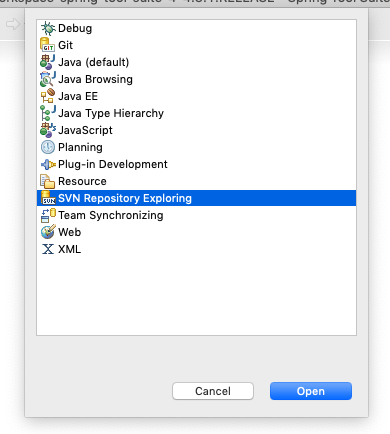 아래와 같이 SVN Repository Exploring 을 선택하고 Open 버튼을 클릭합니다.