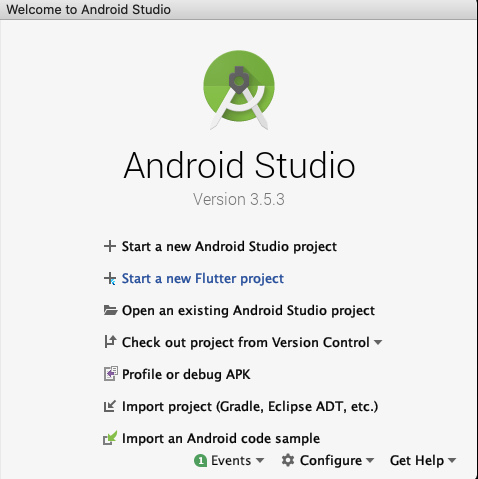 이전 글에서 Flutter Plugin 을 설치 했으니 아래와 같이 Start a new Flutter project 메뉴가 보이게 됩니다.