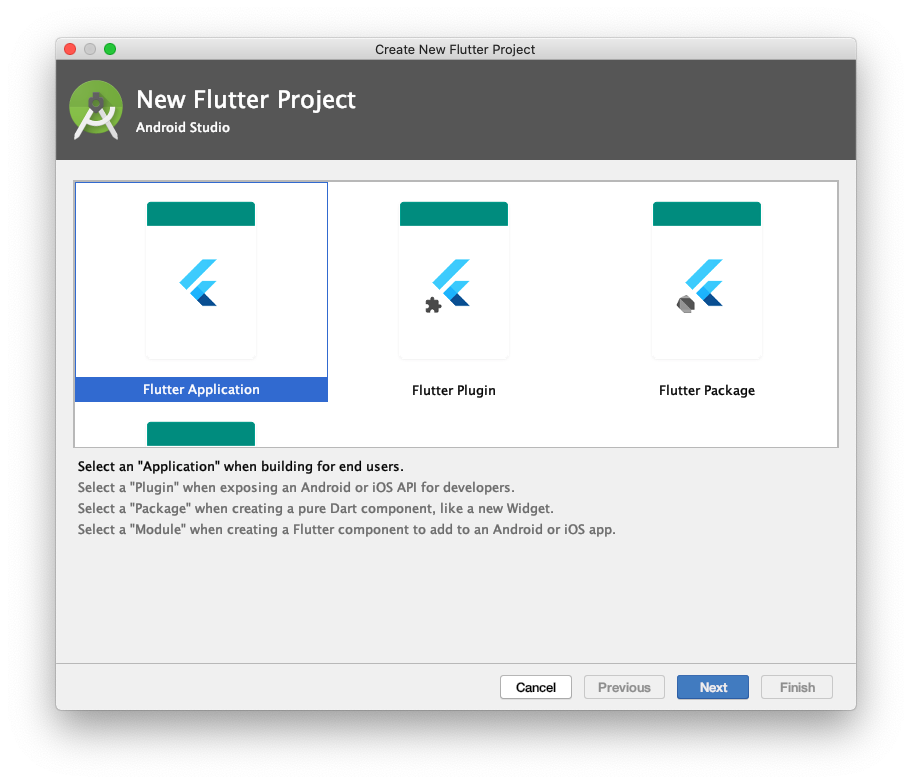 기본 선택인 Fultter Application 항목을 그대로 두고 Next 버튼을 클릭합니다.