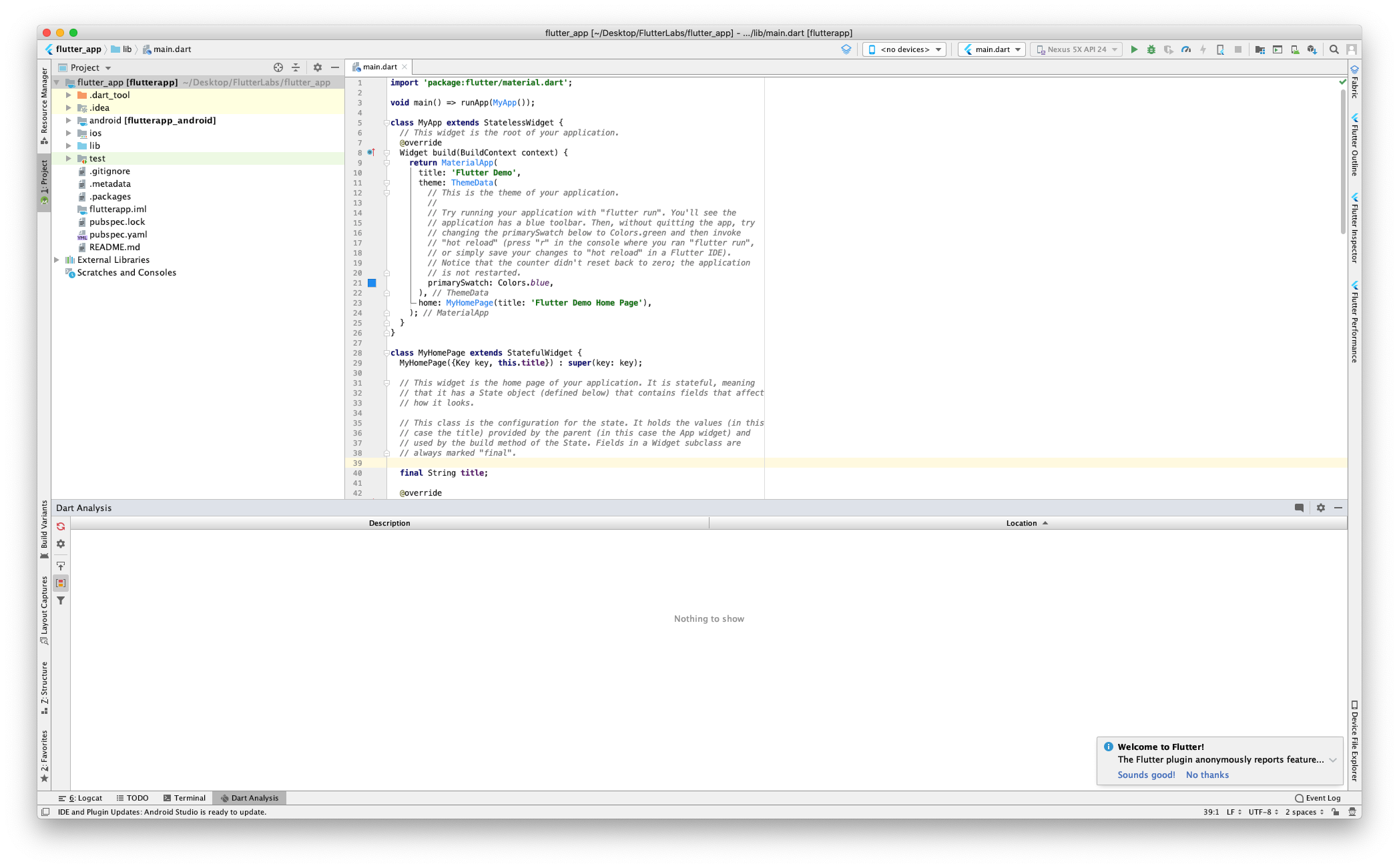기본적인 dart 언어로 되어진 Project 가 생성이 되었습니다.