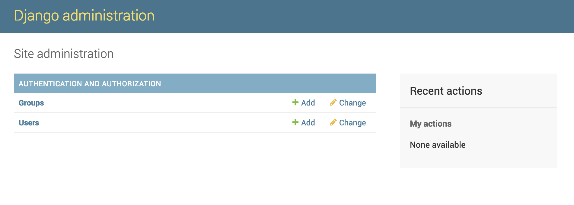 슈퍼관리자로 로그인하였으니 Django 관리 대시 보드화면이 보여지게 됩니다.