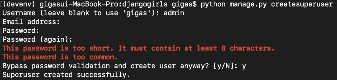 "python manage.py createsuperuser" 명령어를 입력하면 Username을 입력하라고 나옵니다.